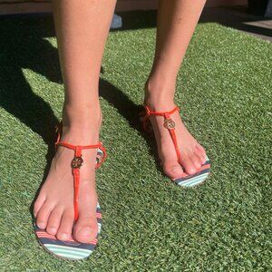 TORY BURCH Womens Sandals Emmy Habanero Stripe Ankle T Strap Buckle Logo Size 7M