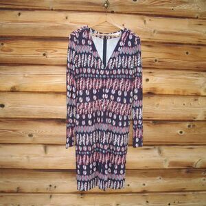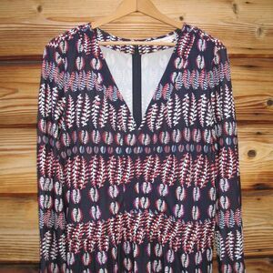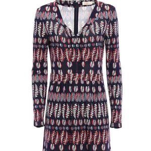 Viscose mini dress detailed with fantasy print in contrasting colours, deep V neck, tonal inserts at neck and waistline, slightly pleated skirt.