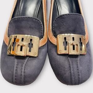 TORY BURCH navy suede & brown leather block career office heels size 7.5