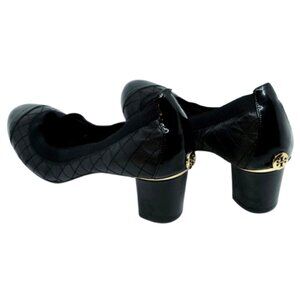 These are Tory Burch CARRIE QUILTED LEATHER CAP TOE PUMPS SHOES GOLD LOGO