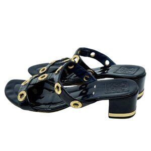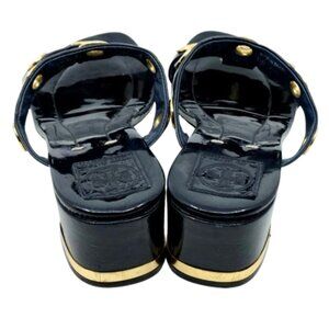 These are Tory Burch KATHRYN GROMMET Blue Patent Leather Mid Height Black Heel Shoes