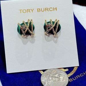 TORY BURCH LOGO GREEN MALACHITE & GOLD STUD EARRINGS