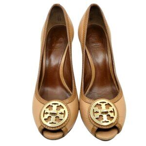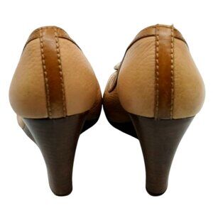 TORY BURCH~Leticia~LEATHER PEEP-TOE~MID-HEEL WEDGE SHOES TAN & BROWN SZ 6.5M
