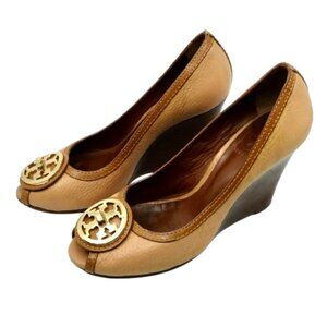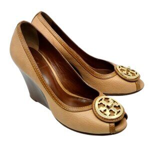 These are Tory Burch " LETICIA" Peep-Toe Mid-Heel Wedge Leather Shoes