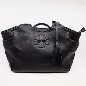 TORY BURCH~thea round tote~TASSELED LARGE HOBO BAG in BLACK PEBBLED LEATHER