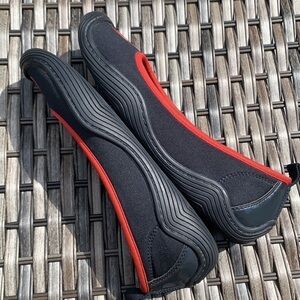 Navy blue neoprene water shoes with red trim and logo. Black rubber soles. Removable footbed.