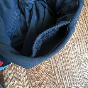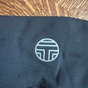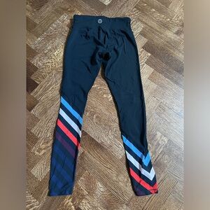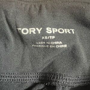 This is a pair of black leggings with diagonal stripes on the legs by Tory sport which is owned by Tory Burch. Size XS. One slit pocket at front of waist band. No content or care label present. Stretchy. Great condition with no known flaws.