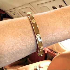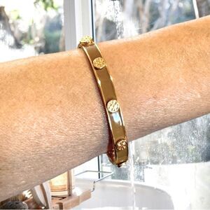 TORY BURCH KIRA GOLD LOGO BROWN ENAMEL HINGE BRACELET