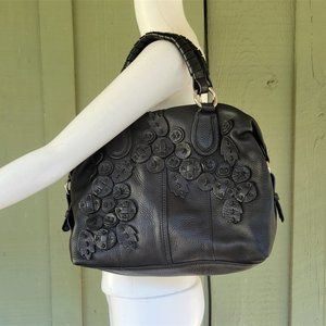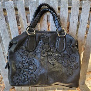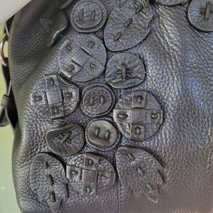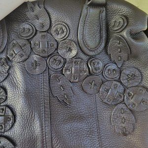 The interior has a zippered pocket and two slip. It closes with a top zipper. The front of the bag has leatehr appliques