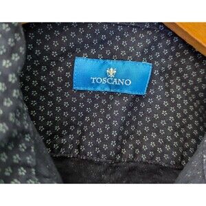 This TOSCANO men's shirt is a size small, featuring a blue floral pattern with short sleeves and a collared neckline. It is designed with a button-down closure and includes pockets. The shirt has a regular fit and is suitable for both party occasions and casual wear during the summer and spring seasons. The design is a mix of a classic and colorful style, making it a versatile and stylish addition to any wardrobe.