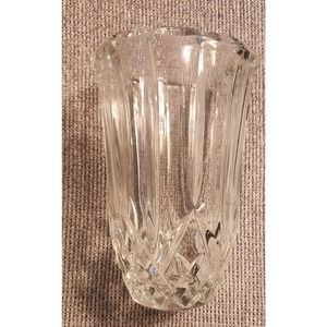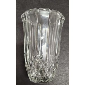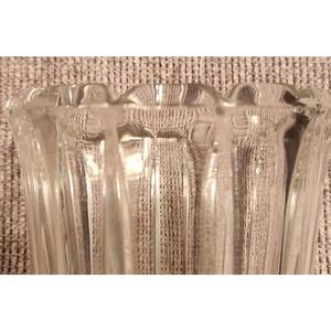Classic lines decorate this clear vase. 6 1/4" tall. No chips, cracks, or scratches.