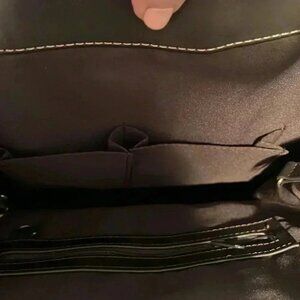 Tote handbag with a two-tone suede and embossed floral pattern, featuring double handles. It's in good condition, free of tears or scuffs on the suede. The interior includes a zippered pocket and two small slide pockets.