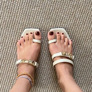 Cream colored croc-embossed sandals with gold clasp detailing from brand TOTEME. These are a size 7. Condition is great— only flaw is natural wear on the bottom of the shoe.