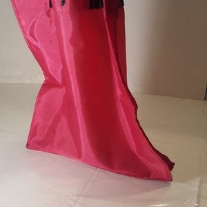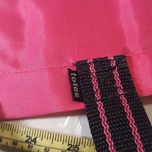 Measures 21" long with handles included, 15" without handles included. Totes Foldable Snap Tote bag. Pink and Black. (Inside pocket for handheld umbrella. 15" long x 3" deep. 14" x 3" base measurements NWOT