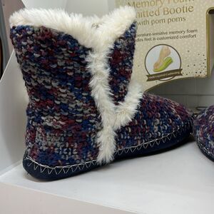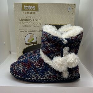TOTES TOASTIES WOMENS MEMORY FOAM. KNITTED BOOTIE WITH POM POMS
