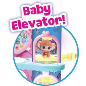 T.O.T.S. Nursery Headquarters Playset includes one playset, five baby animal figures: Mia the Kitten, Marty the Monkey, Bella the Bunny, plus two surprise figures, baby bouncy seat, cloud cart, bathtub play bottle, play brush, slide and removable basket.