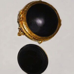 Measures 8" with lid high x 5.75 diameter x 3" deep across bottom square golden pedestal.