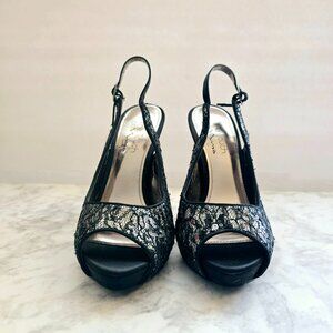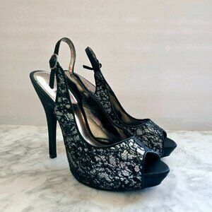 Sequin Black and Silver Lace Sling Back Platform Heels - USA 7.5M