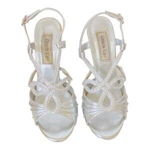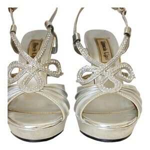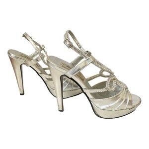 Size: 6M (US) Condition: Good, pre-owned condition. Reinforced crystal-like trim. Some marks throughout. Please see photos for details. Smoke-free, pet-free home. Material: Synthetic. Care: Spot clean. Slingback sandal Dazzling sparkly silver color with crystal-like trim Perfect for special occasions and formal events Adjustable slingback strap for secure fit and elegant style Platform heels for added comfort and height Perfect for a night out, wedding, homecoming, prom Sophistication style statement bride bridesmaid shower princess shine shiny glam glamorous SKU: 546 Wt: 1 lb, 10 oz in shoebox