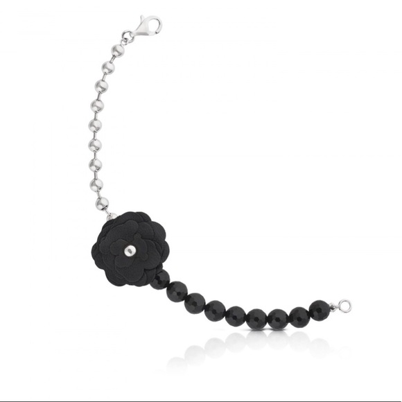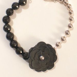 Beautiful and lovely bracelet in silver and onyx. It has a nice black rose made of leather with bear shape petals.