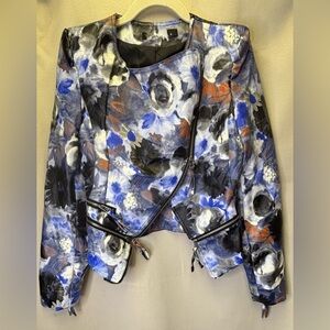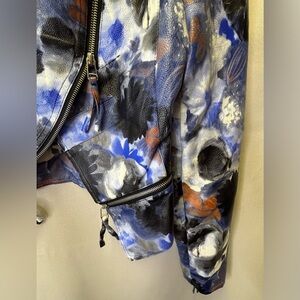 TOV Floral Multicolor Jacket faux leather, machine wash cold, the camouflage jacket comes without a closure, with zippers and features a detachable lower extension with silver zippers closure. sleeve have zippers Brand tag cut off in gently used condition Size 40 US 4/6