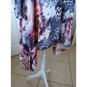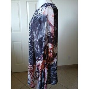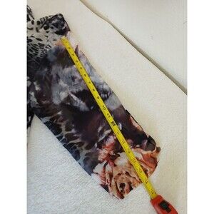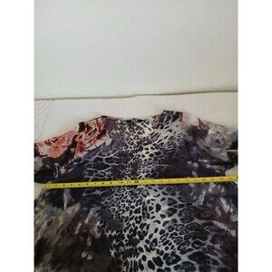 The TOV Los Angeles Women's Blouse Tunic in size 40 features a colorful animal print pattern, making it a versatile piece suitable for various occasions. With a scoop neck, 3/4 sleeves, and asymmetrical hem, this pullover blouse offers a stylish and trendy look. Made from a blend of polyester and spandex, it provides comfort and stretch, perfect for all seasons. Machine washable and easy to care for, this blouse from TOV Los Angeles is a great addition to any woman's wardrobe, combining nature and art themes in a unique and eye-catching design.