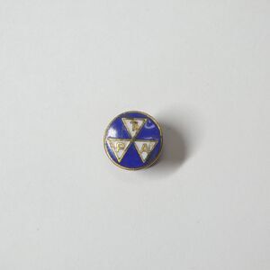 Vintage screwback lapel pin. Front features an enamel design of three white triangles on a blue background, with the letters T P A in the triangles. Possibly a reference to the Travelers Protective Association. Small pin, less than half an inch in diameter. Shows some surface wear as seen in photos.