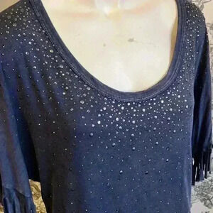 T Party casual glam super soft crewneck T-shirt. Front of shirt is embellished with dark silver studs resembling a beautiful clear starry night! Short sleeves end with rough cut fringe. Vintage washed for that perfectly faded look! NWOT and GORGEOUS!!