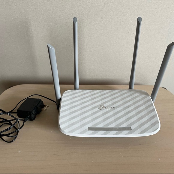 Stylish TP-Link router with dual-tone design. Features four antennas for strong signal.