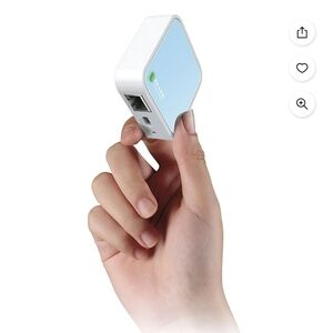 Compact TP-Link wireless nano router in white and blue. Ideal for travel and easy connectivity.