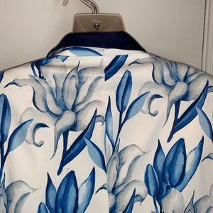 Tailored Recreation Premium jacket. Size L. Very unique jacket with blue, grey & white irises on a white background. Navy chest pocket/shawl collar/pocket flaps. 1 button closure. 5 white buttons on each sleeve. Fully lined & 3 interior pockets. Worn only once so in wonderful shape but there are some small stains on jacket&lining that may or may not come out with dry cleaning -- see last 2 photos). Sorry that it is shown on a female mannequin!! Approximately armpit to armpit =21.5"& length =29"