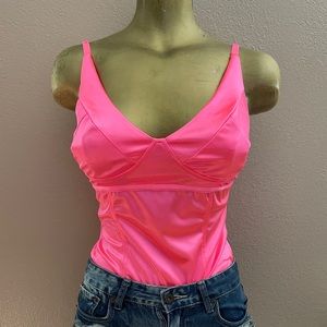 This is a fabulous, new-without-tags, fluorescent neon pink bodysuit by Tracy Anderson. Fabric is 95% polyester, 5% spandex, machine-washable. Item has three snap buttons at bottom, elastic at back of shoulders, adjustable shoulder straps. Fabric is medium weight stretch satin and bodice is fully-lined. Approximate measurements are:
