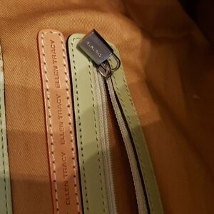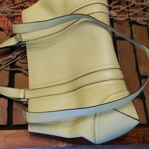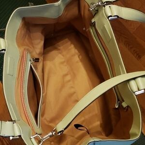 Tracy Ellen leather satchel with removable long strap. color is light green/mint. beautiful large opening with a light brown interior.snap together magnet for closure. approximately 15x10x8 inches