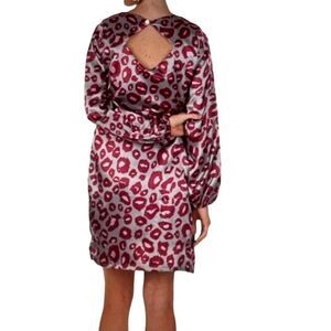 Fun! Flirty! Shiny gray with red and pink leopard print. Long sleeves with elasticized cuffs. Round neckline. Back gold button closure with diamond shaped keyhole. Mini. Silky fabric. Stretch material. Wear year round. Truly a statement piece. Resort wear. Country club. Bin N