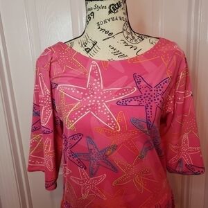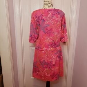 Look stunningly daring and adventurous in this Tracey Negoshian Dress! Featuring a stunning midi-length design with a rounded neckline and ¾ length sleeves, this unique piece features pink starfish designs to help you stand out from the rest. The waist is highlighted with strings and gold balls on each end and gold buttons each sleeve. Whether you're out with the girls or making your way to the beach, make a statement in this 95%polyester dress - perfect for those summer days!{Box1}