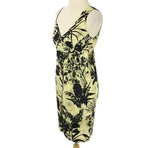 Gorgeous designer Tracy Reese greenish-yellow & black tropical floral pattern sleeveless empire waist dress. Cotton-silk blend. 1 spaghetti & 1 wide strap. Surplice v-neckline. Draped detail on the skirt. Hidden side zipper. Rear vent.
