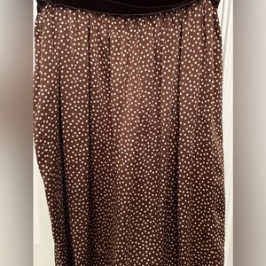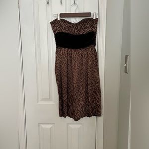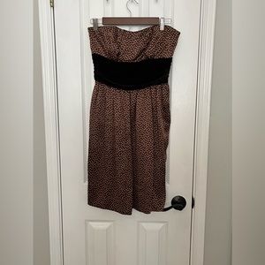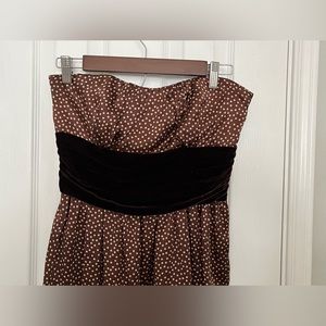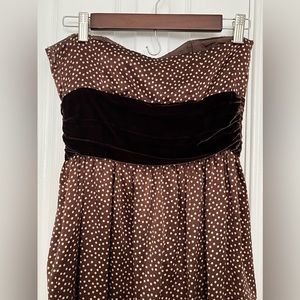 This is a very unique strapless brown and tan polka dotted dress. The bodice has darts and is lightly pleated. It has a darker brown velvet waistband band under the bodice. Perfect for Fall, vintage look.