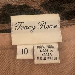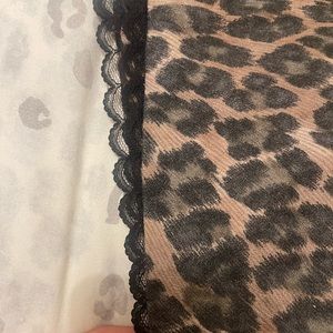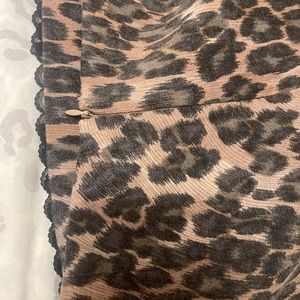 Wool, knee-length, leopard print pencil skirt with black lace trim.