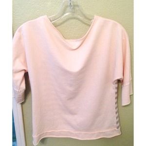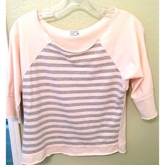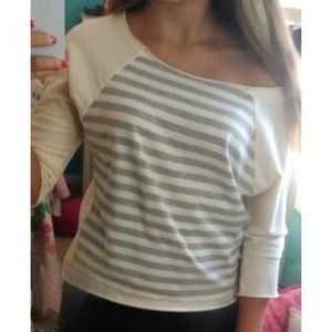 shirt is cream, stripes are grey, top is wide neck or off shoulder, Very Beachy!