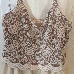 Flowy. Khaki colored. Chiffon. Adjustable straps. Worn once for a party but it's too short for me, I'm 5'3"