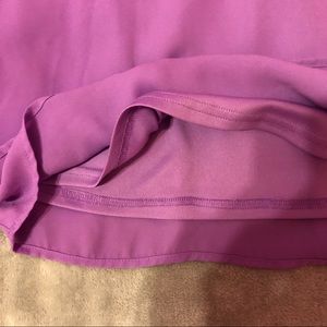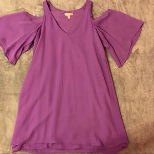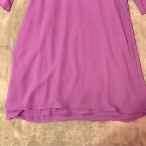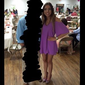 From Dillard’s, I wore this one time to a friends wedding, it’s super flowy and cute, kind of a lilac purple, it’s double layered and also has a slip under the two sheer layers, “open” back detail, I’m 5’5 and it hits at my mid-upper thigh so it’s fairly short, has shoulder cut outs :)