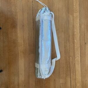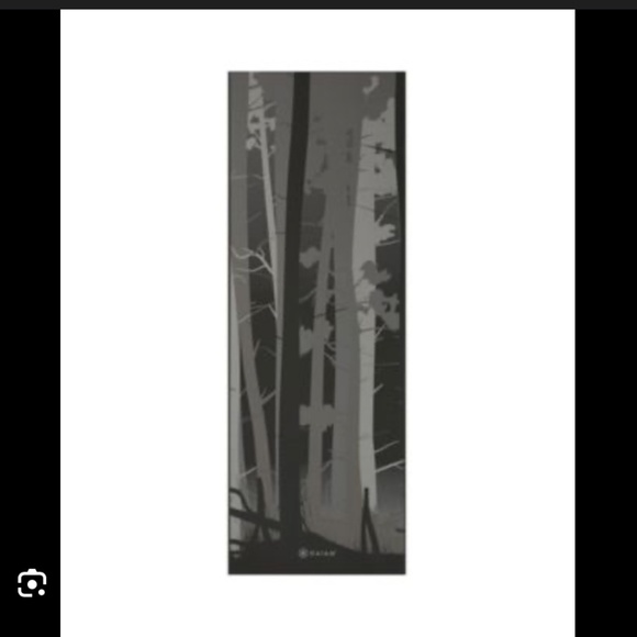 Reversible yoga mat by Gaiam. Color is "Deep Forest" - various shades of gray, black and white with a treed forest on one side and beautiful tree ring patter on the other. Six mm thickness provides extra-cushioning, which supports joints while you explore longer and harder poses. The texture of this mat is made from no slip, grippy material, keeping you in place during any pose. Product dimension - 24" L x 4.5" W x 4.5" H. Like new condition! Comes with metallic silver yoga mat carrying bag with a full zip side, drawstring top, and shoulder strap.