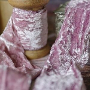 Handmade silk velvet pink ribbon. Dusty pink color, raw edge, vintage inspired, and hand-dyed. Perfect for shabby chic hair styles or can be used for wedding bouquets, gift wrap, decor, or toy accessories. Ribbon in my hair is the item for sale (see third picture). Brand new!