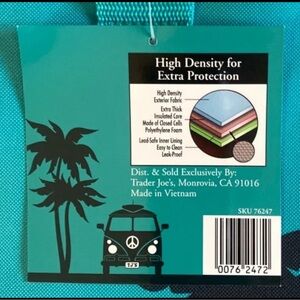 This Trader Joe's tote bag is perfect for keeping your groceries fresh and organized. With a capacity of 8 gallons, it's great for a large shopping trip or for storing leftovers. The teal color adds a pop of color to your kitchen and the nylon material is durable and easy to clean. The bag features a zipper for secure closure and is made in Vietnam.