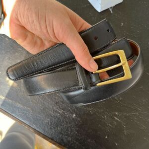 This timeless belt is an essential component of every man's wardrobe. The right belt instantly elevates any outfit, and with its detailed stitching and fine leather, this belt makes a powerful statement. Its clean lines and solid brass buckle will put the finishing touch on your workday suit, church attire, or casual Friday night khakis. Made from high-end Cortina leather that only gets better with age, this is sure to become your go-to belt.