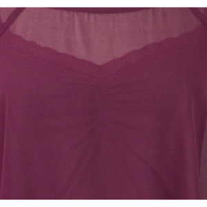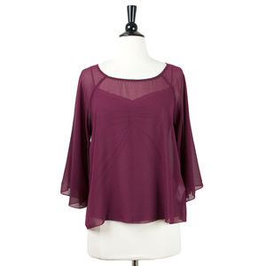 Deep wine chiffon blouse with high curved neckline, 3/4 bell sleeves, loose fitting silhouette and a slight v-back with solid fabric strap across the back of the neck. Comes with a heathered wine camisole featuring stretchy spaghetti straps, ruched bust and delicate lace trim.