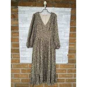 bestselling Aurora dress is fabulous in this cute green heart print. A deep V neck falling to a pleated midi skirt and smocked waist. 100% Polyester. Machine wash in very good condition