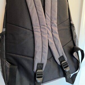 TRAILMAKER EQUIPMENT Backpack with double zippered closure. Unisex. NEW-never used. Front pocket plus exterior Elastic straps for misc. jacket/blanket/towels etc. Large interior side pocket. Padded back and padded adjustable shoulder straps. 2 exterior large side mesh pockets for water bottles. Hook at top for hanging. 100% Polyester. Black with accents of gray front pocket and charcoal gray bottom.