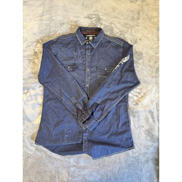 TRANQUILITY AND MAYHEM Men's Large Shirt Blue Pockets Rebels Graphic