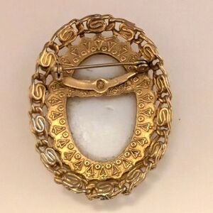 TRANSFERWARE Cameo Ornate Painted Oval Brooch Vintage French Serenade Pin Gold